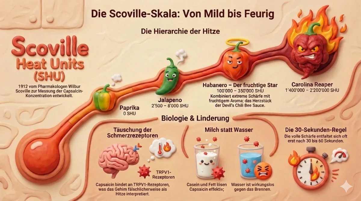 Capsaicin bindet an Schmerzrezeptoren (TRPV1) in der Mundschleimhaut. Das Gehirn interpretiert das als Hitze. Milch (Casein) oder fetthaltige Speisen lösen Capsaicin und lindern die Schärfe – Wasser hilft nicht.